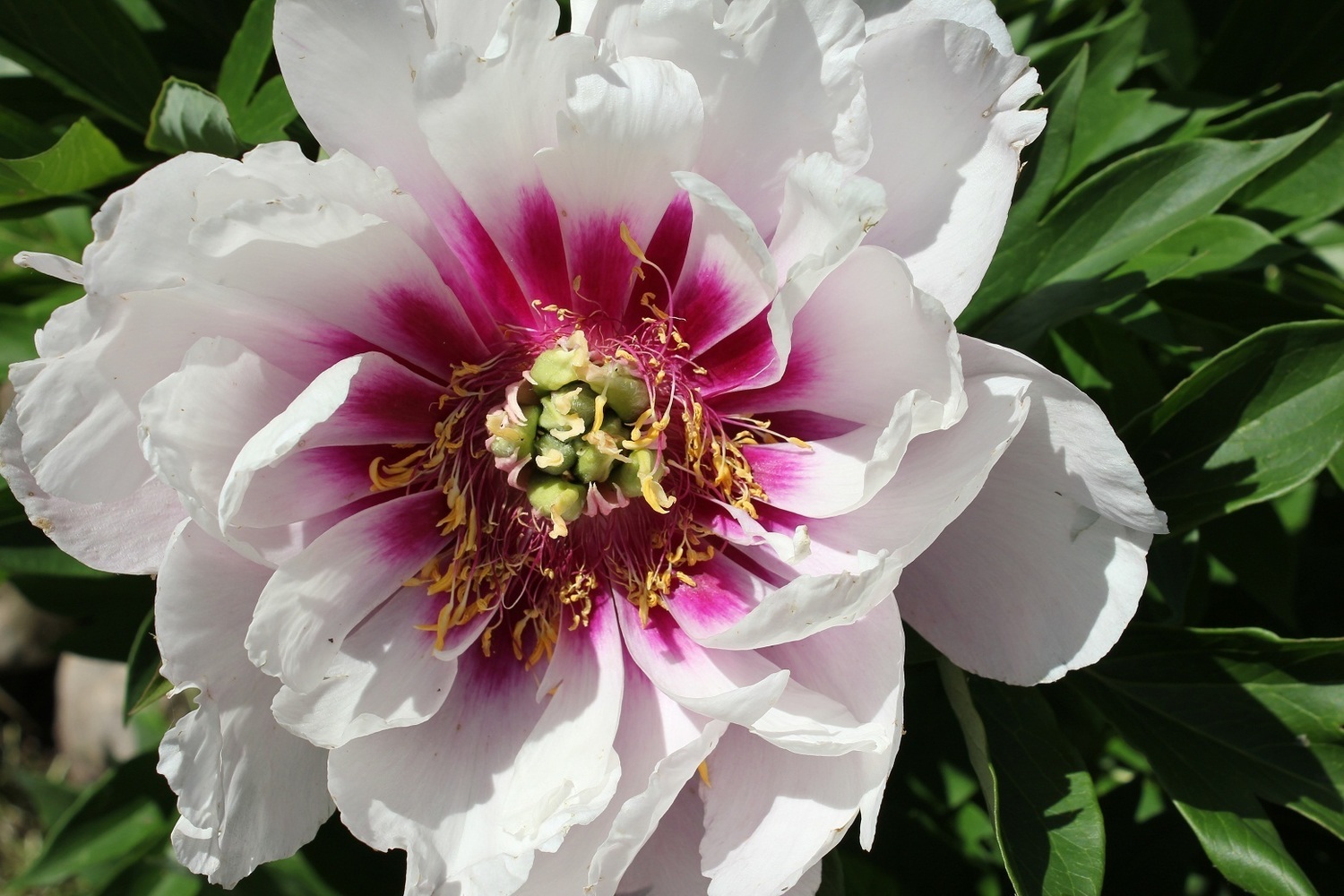 Пион Cora Louise (Кора Луиз) – это изысканный гибрид, который станет настоящим украшением вашего сада. Его крупные, полумахровые цветы привлекают внимание нежными белыми лепестками с легким розовым оттенком и ярко-фиолетовым центром. Этот сорт отличается не только своей красотой, но и устойчивостью к болезням, что делает его идеальным выбором для любого садовода.